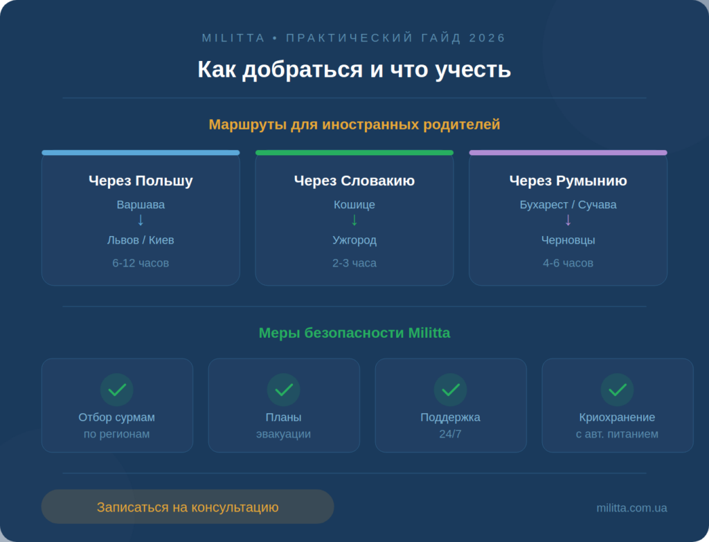 Агентство Militta помогает с организацией поездки: трансферы, размещение, сопровождение на границе и помощь с консульскими вопросами. Обычно родителям нужно 1–2 поездки: в начале программы и после рождения ребёнка. |